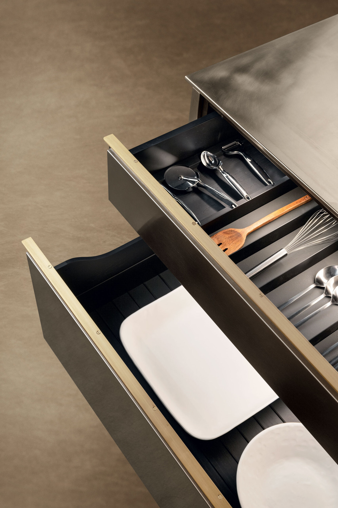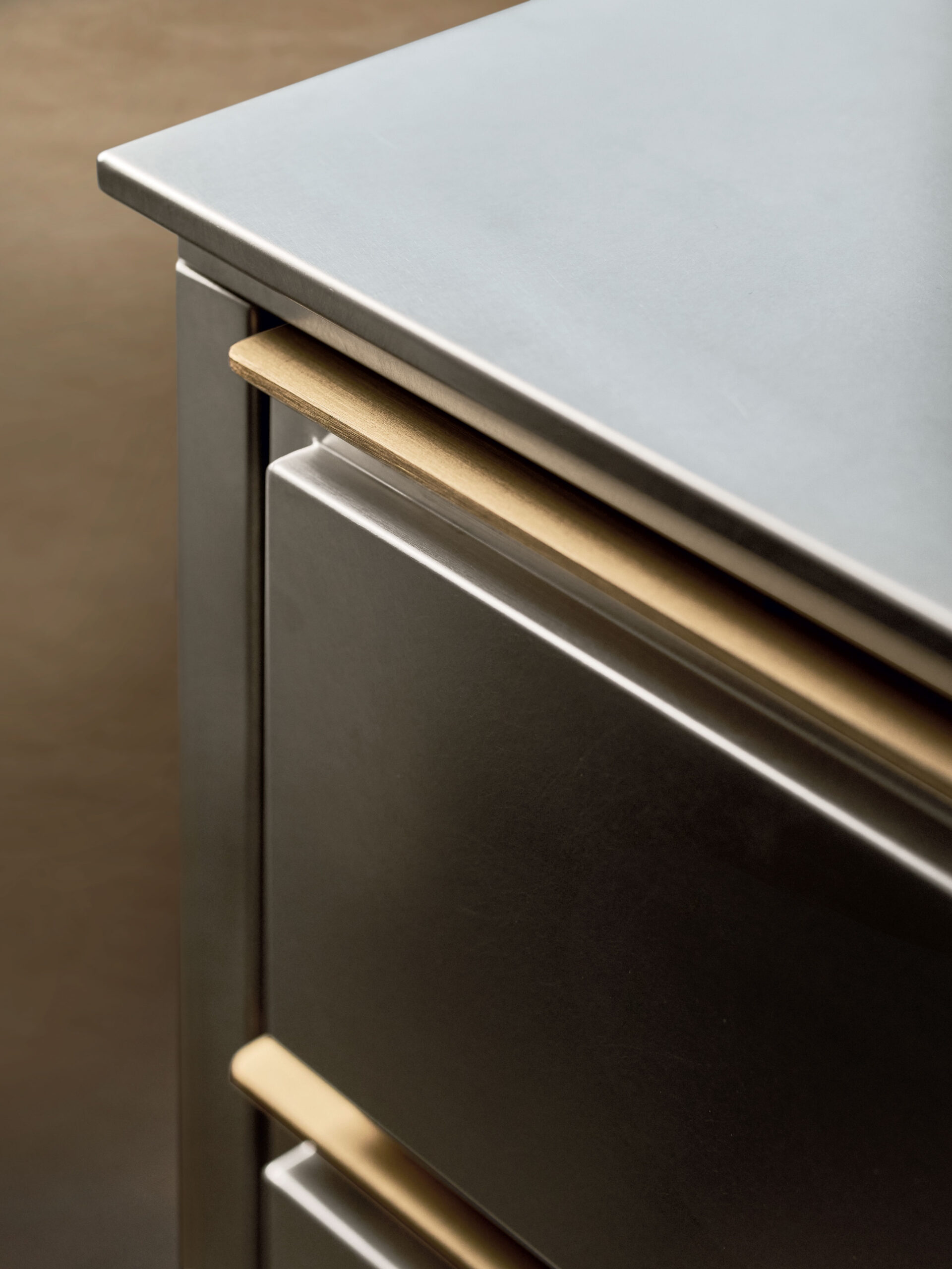 입체적인 효과를 주는 매끄러운 프레임의 스틸 도어는 황동 소재로 더욱 돋보이며, 도어와 서랍의 손잡이 역할을 하면서도 도어의 형태를 더욱 강조합니다. Virtus 주방은 사용과 편의성을 모두 고려하여 디자인된 중앙 아일랜드로 완성되어, 미적인 엄격함과 실용성의 균형을 이룹니다.