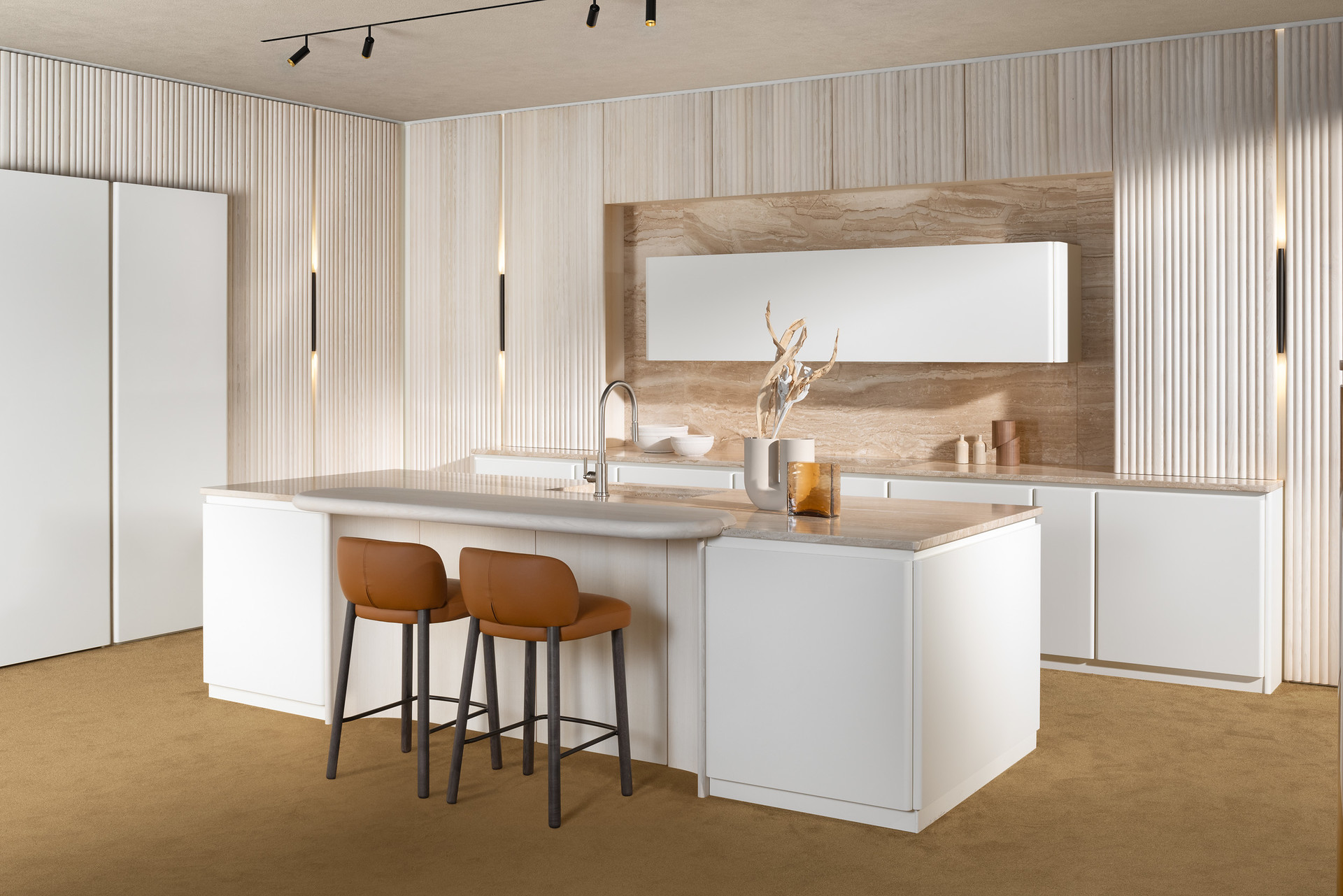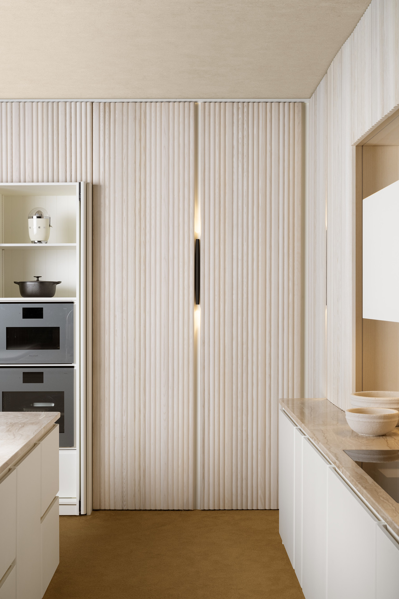 미셸 마르콘(Michele Marcon)이 디자인한 에테시아(Etesia) 주방은 밀폐형 옻칠 원목으로 제작되었으며, 이 모델의 특징인 수직 도어 가장자리의 특징적인 둥근 마감을 통해 그 매력을 드러냅니다.